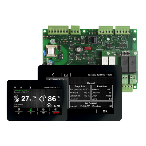 Контролер дозволяє вручну регулювати цикли зберігання і автоматично програмувати цикли дозрівання (до 30 фаз по каскадній моделі) з можливістю вільного конфігурування тривалості, температури, вологості і вентиляції.